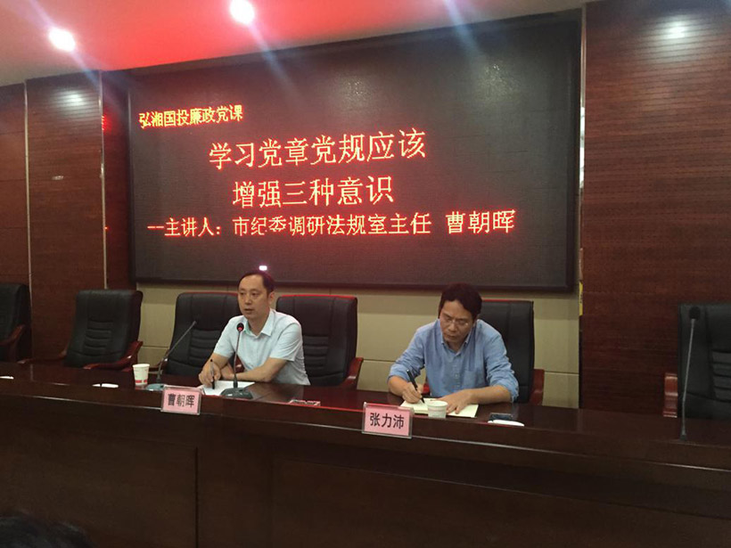為慶祝建黨96周年,進一步增強公司黨組織的凝聚力和戰(zhàn)斗力,提高黨員干部拒腐防變能力,6月27日下午,弘湘國投舉辦“迎七一”專題廉政黨課活動。會議邀請市紀委調(diào)研法規(guī)室主任曹朝暉作輔導(dǎo)講座。弘湘國投本部全體人員及子公司班子成員共計90余人聆聽了講座,公司黨組書記、董事長張力沛主持。