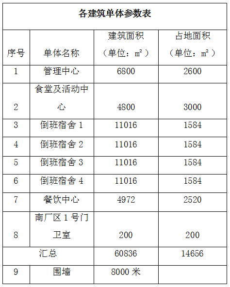 4、采購項(xiàng)目內(nèi)容包括:管理中心、食堂及活動(dòng)中心、倒班宿舍(暫定四棟)、餐飲中心、南廠區(qū)門衛(wèi)室、圍墻立面概念設(shè)計(jì),各單體參數(shù)如下表: