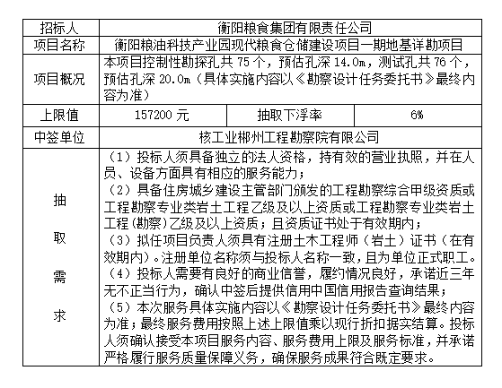 衡陽糧油科技產(chǎn)業(yè)園現(xiàn)代糧食倉儲建設項目一期地基詳勘項目抽取結(jié)果公示